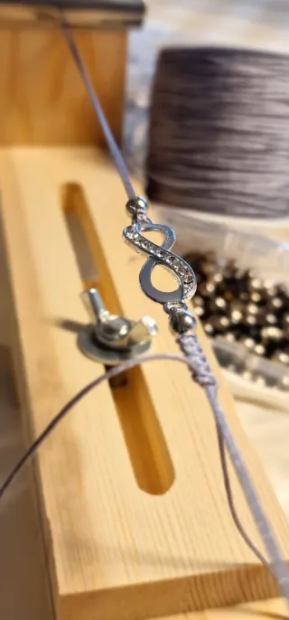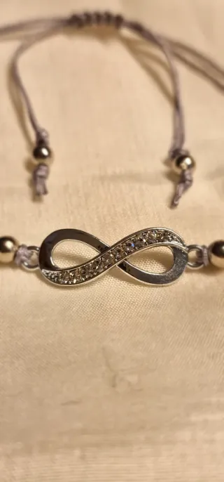 Pulsera tejida con hilo gris perla y un diseño de infinito adornado con pequeñas piedras brillantes. Es un accesorio delicado y elegante. - Símbolo de infinito. - Detalles de pedrería. - hilo gris perlado. - Detalle bolas plateadas