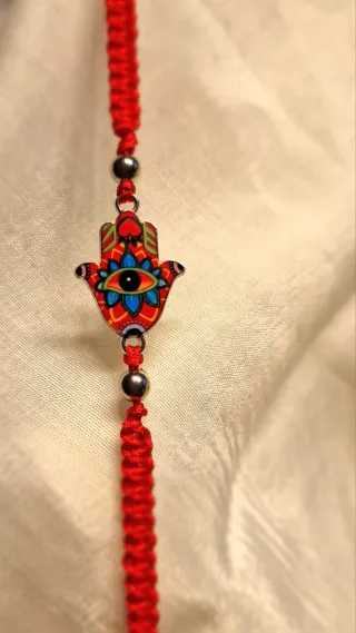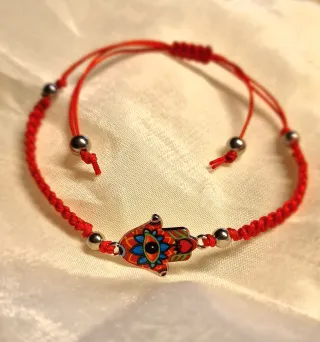 Pulsera tejida a mano con un diseño de la Mano de Fátima. - Elaborada con hilo rojo. - Detalle de la Mano de Fátima multicolor. - Bolas plateadas - Ajuste corredizo - Se entrega con etiqueta y bolsa pequeña de tull