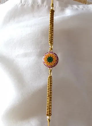 Pulsera artesanal con un diseño de mandala central. - Detalle abalorios - Tejida a mano hilo. - Detalle de mandala multicolor. -Se entrega con etiqueta y bolsa de tull transparente