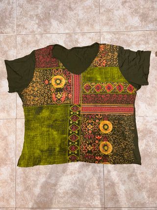 Camiseta de mujer con un diseño vibrante y colorido. Presenta un estampado geométrico y floral. - Mangas cortas. - Cuello en V. - Tejido ligero y cómodo. Talla XL.