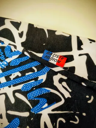 Camiseta de la reconocida marca francesa Batiste Million con un diseño llamativo y moderno basado en dibujos abstractos y graffitis combinados con pedrería. -Talla M , aunque es un poco pequeña y puede servir para una S. -Fondo negro con estampado azul y blanco. Más artículos en mi perfil.