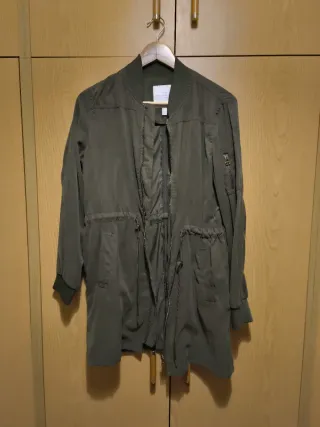 Gabardina larga de color verde militar, con un diseño moderno y versátil. - Cierre de cremallera. - Cintura ajustable con cordón. - Bolsillos frontales. - Puños elásticos.