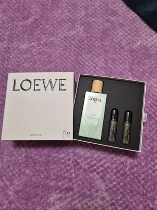 Estuche de perfume Loewe Aire Sutileza. - Incluye un frasco principal de 100 ml. - Contiene dos viales de viaje adicionales un vial a juego de 10ml y un vial complementario de 10 ml de LOEWE Solo Ella Elixir. - Sin usar no acerté en regalo Reyes y no lo puedo devolver, adjunto pantallazo de lo que me costó.