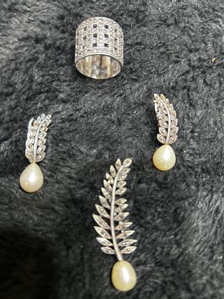 Elegante conjunto de joyería de plata. - Anillo con diseño de rejilla y pequeñas incrustaciones. - Dos pendientes colgantes con forma de hoja y perla. - Un colgante a juego con forma de hoja y perla.