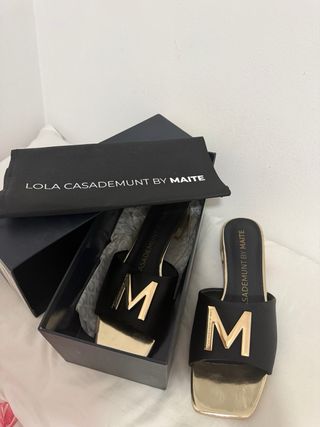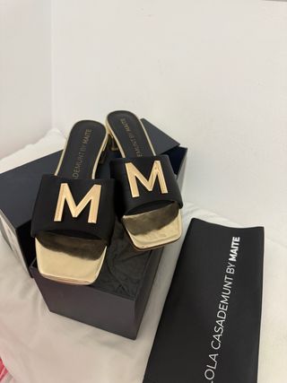 Sandalias de la marca Lola Casademunt con un diseño moderno y elegante. - Diseño de tira ancha con la inicial M dorada. - Punta cuadrada. - Tacón bloque dorado. - Acabado exterior en piel. - Incluye bolsa guardapolvo de la marca.