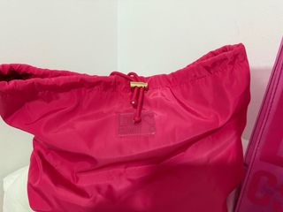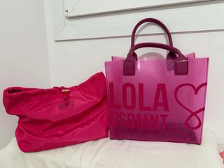 Bolso de mano transparente con logo. - Color rosa vibrante. - Diseño moderno y llamativo. - Asas resistentes.
