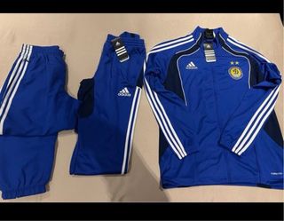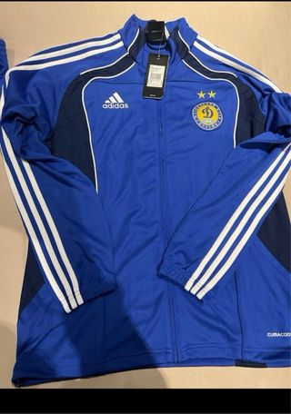Conjunto de chándal del Dinamo de Kiev. - Chaqueta deportiva con cremallera completa. - Pantalón de chándal. - Diseño con las icónicas tres rayas de Adidas.