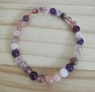Pulsera elaborada con cuentas de Súper 7 natural. POderosa combinación de siete minerales (Amatista, Cuarzo Ahumado, Cuarzo Transparente, Cacoxenita, Lepidocrocita, Rutilo, Goethita) que potencia la espiritualidad, elevando la conciencia, alineando todos los chakras y fortaleciendo la intuición, no necesita limpieza y armoniza cuerpo y mente, promoviendo el crecimiento espiritual, la protección y la claridad mental. - Tamaño de las cuentas: 6mm. - Diseño elástico para mayor comodidad.