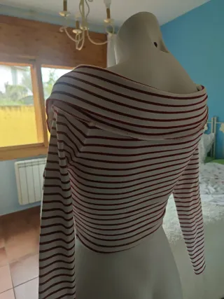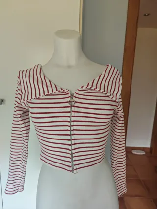 Jersey de rayas rojas y blancas con un diseño moderno y entallado. - Cremallera frontal plateada. - Cuello tipo polo. - Manga larga.