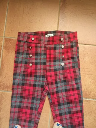 Pantalones de cuadros con un diseño llamativo. - Estilo de cintura alta. - Detalle de botones dorados en la parte delantera. - Patrón de cuadros escoceses en rojo y gris.