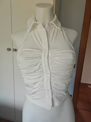 Este top blanco es una prenda versátil y elegante. - Diseño sin mangas. - Cuello halter. - Detalle de botones frontales. - Fruncido en el pecho.
