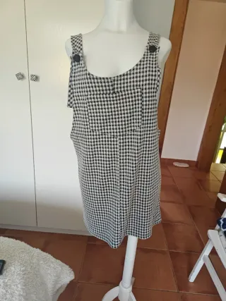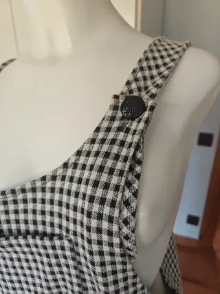 Vestido tipo pichi con un bonito estampado de cuadros. - Diseño de tirantes. - Cierre con botones en los tirantes. - Largo hasta la rodilla.
