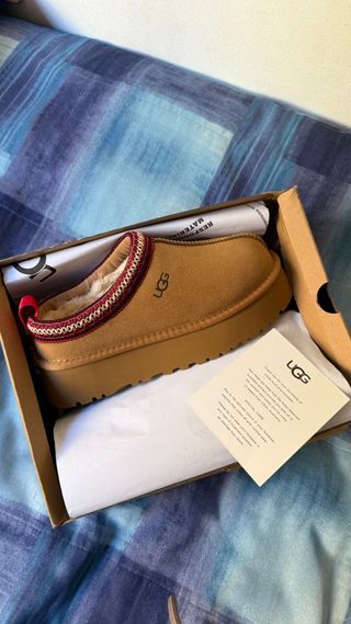 Zoccoli UGG Tazz II en ante marrón. - Forro interior de lana. - Suela gruesa y resistente. - Detalle con elástico decorativo en el borde.