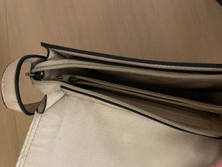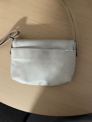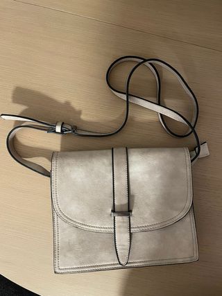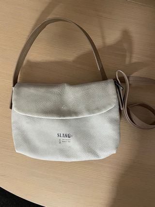 Bolso de la marca SLANG en tonos beige y blanco. Un accesorio versátil y moderno. - Diseño con solapa. - Correa ajustable.