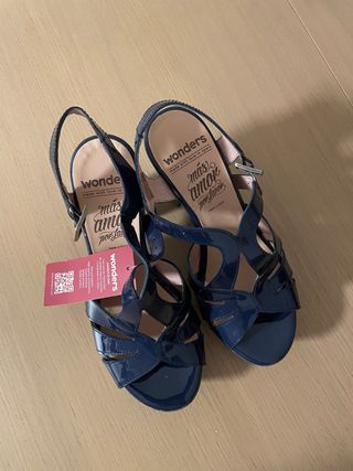 Elegantes sandalias de la marca Wonders en color azul. - Diseño con tiras cruzadas. - Cierre de hebilla. - Tacón cómodo.