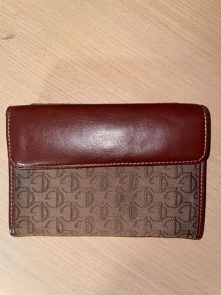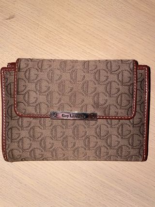 Elegante cartera con el distintivo monograma de la marca. - Diseño con monograma. - Ribetes en piel marrón. - Placa metálica con el nombre de la marca. - Precio negociable