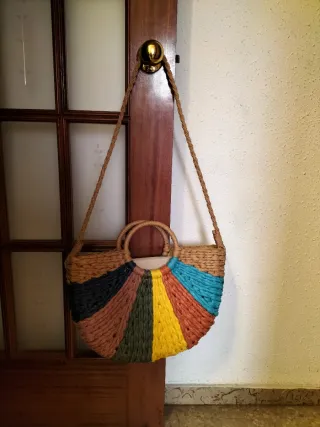 Bolso de rafia con un diseño llamativo y veraniego. - Material: Rafia. - Asa de mano y asa larga para colgar. - Diseño de abanico con varios colores.