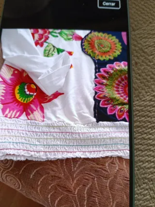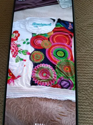 Camiseta de la marca Desigual con un diseño vibrante y alegre. - Estampado llamativo con círculos y flores. - Mangas cortas. - Cuello redondo.