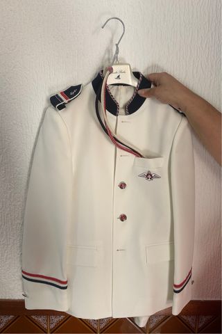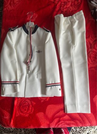 Conjunto de traje de comunión en color blanco, ideal para una ocasión especial. Incluye chaqueta y pantalón. - Chaqueta con cuello y puños de contraste. - Detalles de pasamanería en cuello, puños y hombros. - Insignia bordada en la solapa. - Pantalón con cintura elástica. - No se ve etiqueta de marca.