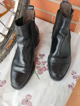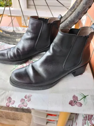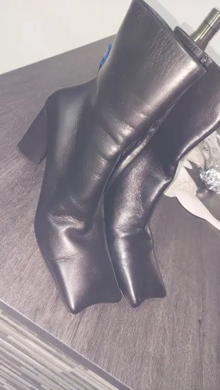 Vendo botines Balenciaga auténticos modelo Square Knife en piel de becerro color negro. Un diseño vanguardista y minimalista con la icónica punta cuadrada plana y tacón de bloque geométrico. Son extremadamente elegantes y un "must-have" para coleccionistas de la marca. Estado: Muy buen estado general. La piel está cuidada y flexible. Las suelas presentan el desgaste natural de uso (ver fotos), pero la estructura y los tacones están impecables. Material: 100% Piel de alta calidad (Made in Italy). Talla: 38.5 (Tallan fiel a la talla). Detalles: Cierre de cremallera lateral tonal y número de serie grabado en el interior