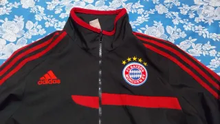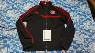Chaqueta deportiva del Bayern de Múnich. - Diseño con franjas rojas en las mangas. - Cierre de cremallera frontal. - Escudo del club en el pecho.