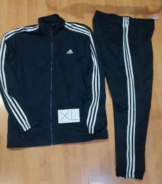 Conjunto deportivo Adidas de dos piezas. - Chaqueta con cremallera completa. - Pantalón a juego. - Diseño clásico con tres rayas en las mangas.