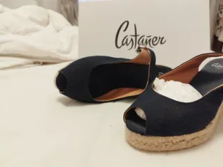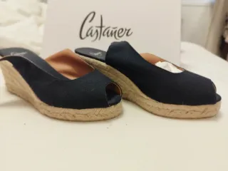 Elegantes alpargatas de cuña con un diseño abierto en la punta. - Material exterior de tela. - Suela de esparto. - Forro interior de piel.