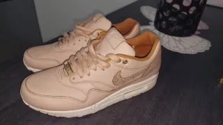 Zapatillas Nike Air Max 1 en tonos beige y detalles dorados. Diseño elegante y moderno. - Material exterior de cuero. - Detalle de estampado en el Swoosh. - Suela blanca con unidad Air visible.