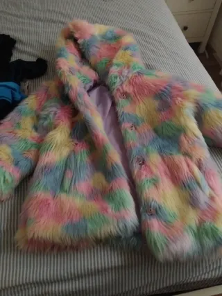 Abrigo de pelo sintético con un diseño tie-dye vibrante. Es una prenda llamativa y suave. - Diseño tie-dye - Tacto muy suave - Cierre de botones