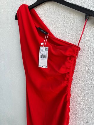 Vestido largo de fiesta en color rojo, con diseño asimétrico y detalles fruncidos en el lateral. - Diseño de un solo hombro. - Largo hasta el tobillo. - Tejido con caída. - talla xs , nuevo sin estrenar