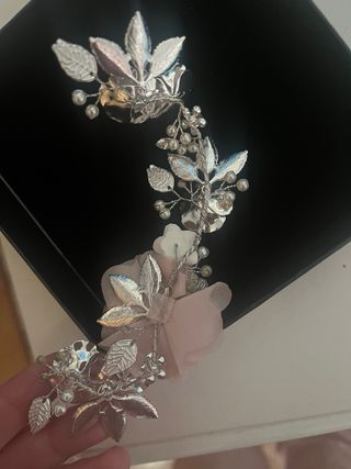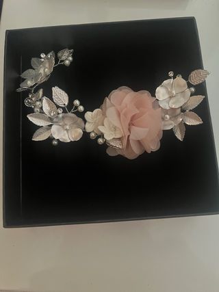 Precioso tocado para el pelo con un diseño delicado y elegante. - Adornado con flores y hojas en tonos plateados. - Detalles de perlas y pedrería. - Un toque de color con una flor central en tono rosa.