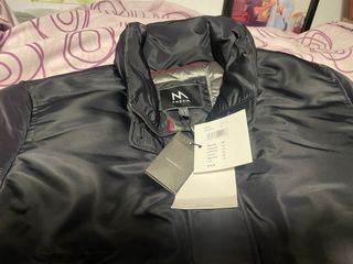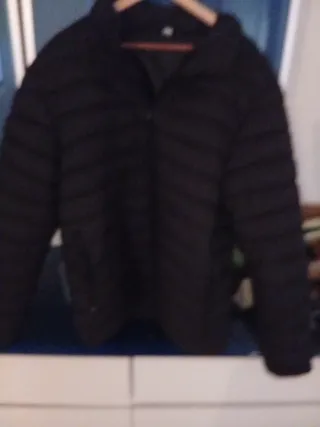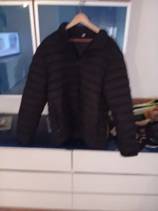 Plumón negro con un diseño acolchado. - Cierre frontal. - Cuello alto.