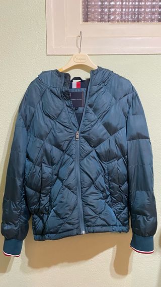 Abrigo acolchado con diseño de rombos. Abrigo original de Tommy Hilfiger, color verde, talla M. Diseño moderno y funcional, ideal para los meses de otoño e invierno. Acolchado que aporta abrigo sin resultar pesado, con un estilo limpio y fácil de combinar. La prenda se encuentra en perfecto estado, muy bien cuidada, sin manchas, desgaste ni defectos. Cremalleras, botones y costuras en excelente condición. - Cierre de cremallera. - Puños elásticos. - Capucha integrada.