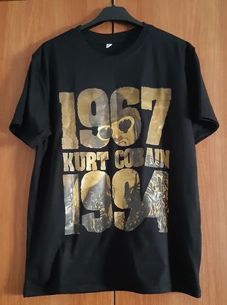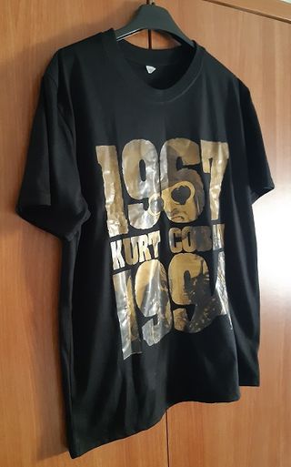Camiseta unisex con diseño de Kurt Cobain (Nirvana) - Estampado frontal con 1967 KURT COBAIN 1994. - Talla XXL. (Pero mas bien es una XL) - 100% Algodon. - Diseño en dorado y negro.