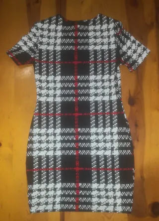 Vestido con un llamativo estampado de cuadros. - Diseño de manga corta. - Largo hasta la rodilla. - Tejido cómodo y flexible.