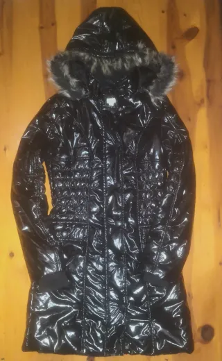 Abrigo largo negro con acabado brillante y detalles acolchados. Cuenta con capucha con pelo sintético. - Cierre de cremallera. - Bolsillos frontales. - Puños ajustados.