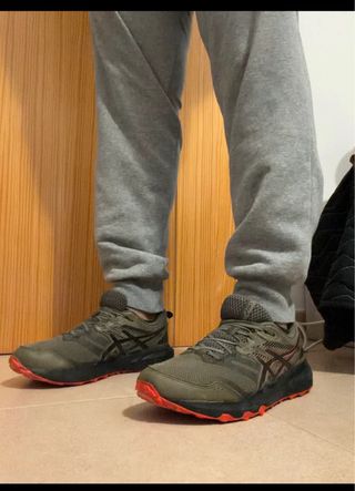 Zapatillas deportivas Asics Gel Sonoma 6 en tonos verdes y detalles rojos. Perfectas para trail running o senderismo. - Parte superior de malla transpirable. - Amortiguación GEL para mayor comodidad. - Suela de goma con buen agarre.