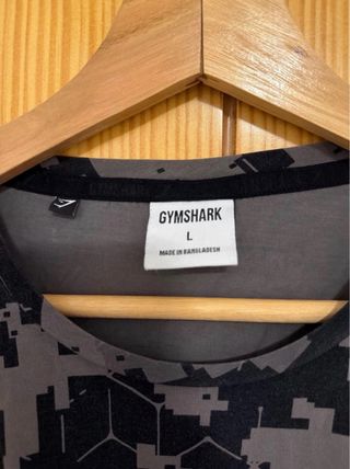 Camiseta de manga corta con un diseño de camuflaje digital en tonos grises y negros. Presenta el logo de la marca en blanco en el pecho. - Diseño de camuflaje digital. - Logo de Gymshark en el pecho.
