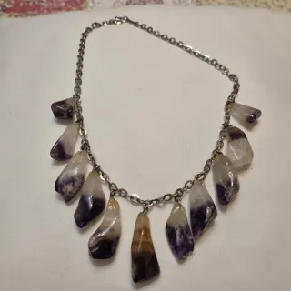 Bonito collar vintage con colgantes de piedra natural tipo amatista / cuarzo en tonos lila y violeta, algunos con zonas amarillas naturales. Diseño artesanal con varias piedras colgantes engarzadas en cadena plateada. Las piedras están frías y son de cuarzo natural. Estado: algunas puntas presentan pequeños golpes o roturas (se aprecia en las fotos), por lo que el precio es reducido. Aun así es una pieza muy bonita y original. Ideal para amantes de las piedras naturales, bisutería vintage o minerales. Mira en mi página tengo muchas cosas de bisutería. Hago envio por Wallapop opcion correos no IMPOST ni GLS