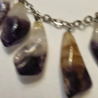 “Piedras naturales de amatista y cuarzo. Cada pieza es única.”Bonita gargantilla con 11 piedras naturales de amatista y cuarzo pulidas. Las piedras presentan un precioso degradado natural en tonos violeta, blanco y ámbar, lo que hace que cada pieza sea única. Las piedras están frías al tacto y tienen un aspecto muy natural. Montadas en cadena metálica formando un collar corto tipo gargantilla muy elegante. Ideal para amantes de las piedras naturales, minerales o bisutería artesanal. Muy buen estado.Cadena metálica con acabado plateado de estilo artesanal. Protección. Hago envios por Wallapop opción correos No IMPOST NI GLS