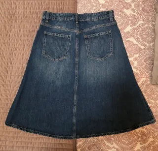 Falda vaquera de Mango con corte A. - Diseño clásico de cinco bolsillos. - Cierre de cremallera y botón. - Largo midi. Usada una sola vez, me resultó grande