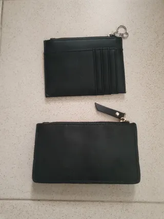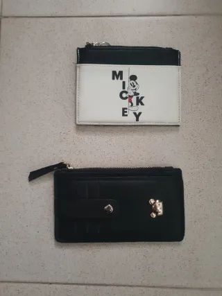 Dos monederos tarjeteros, uno con diseño de Mickey Mouse y otro en color negro. - Monedero blanco con Mickey Mouse y cremallera. - Monedero negro con detalle de botón y cremallera.