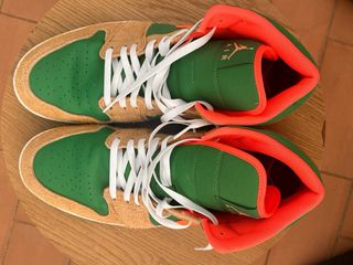 Zapatillas Air Jordan 1 Mid en excelente estado, casi nuevas. - Combinación de colores verde, marrón y naranja. - Diseño de corte medio. - Cordones blancos.