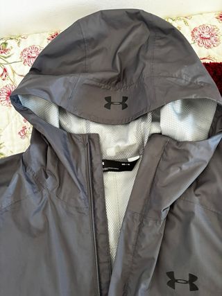 Chubasquero de la marca Under Armour en color gris. Ideal para protegerse de la lluvia. - Capucha integrada. - Cierre de cremallera frontal. - Logo de la marca visible en el pecho y la capucha.