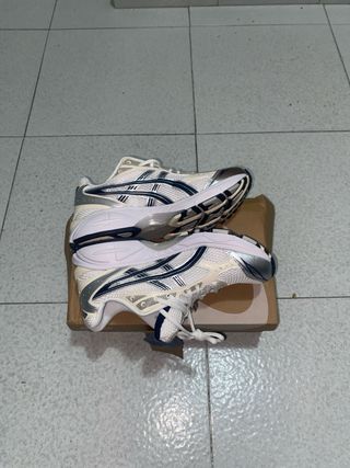 Zapatillas deportivas Asics Gel Kayano 14 en tonos plateados y blancos. Un diseño moderno y cómodo. - Parte superior de malla transpirable. - Detalle de superposiciones sintéticas. - Suela con tecnología GEL para amortiguación.