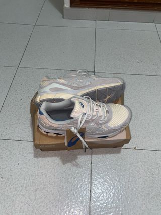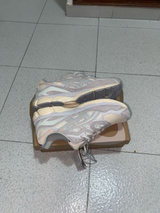Zapatillas Asics Gel NYC en tonos beige y gris. Un diseño moderno y cómodo. - Parte superior de malla y ante. - Detalles en azul claro y rosa pálido. - Suela de goma para mayor tracción.