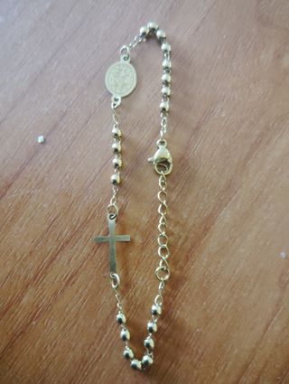 Elegante pulsera religiosa con detalles significativos. - Diseño con cruz y medalla. - Cadena ajustable para mayor comodidad. - Acabado en tono dorado.