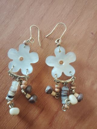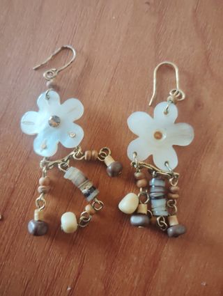 Pendientes con un diseño delicado de flor nacarada y adornos de cuentas. - Cuentas de madera y piedra. - Cierre de anzuelo.
