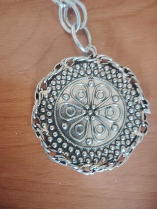 Elegante collar con un diseño intrincado en el colgante. - Cadena de eslabones plateados. - Colgante redondo con detalles grabados. - Estilo vintage.