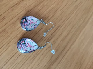 Pendientes con diseño oriental de flores rosas y ramas. - Forma de gota. - Cierre de anzuelo con tope de silicona. - Detalle de ramas y flores en tonos rosas y azules. - con su cajita de regalo -solidario para la asociación de animales de valencia los hijos del viento rescue valencia ❤️🩹🐾